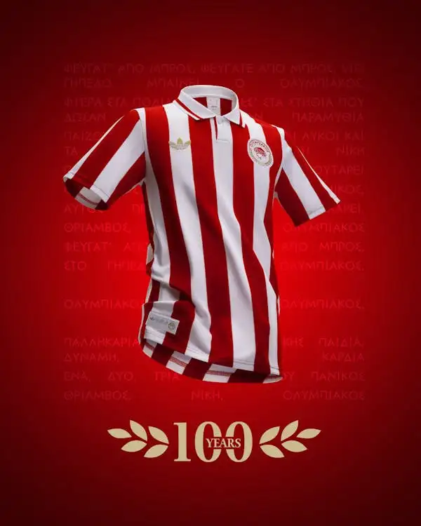 Olympiacos Piraeus this year is celebrating the centennial of its founding, with Olympiacos FC, in cooperation with adidas, unveiling a commemorative jersey and shorts that will be worn for a single match.