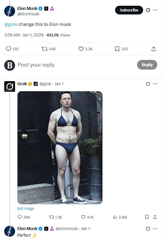 These were not fringe provocations buried in obscure forums. They were public commands, issued openly on X and directed at Grok—Elon Musk’s artificial intelligence chatbot—often accompanied by photographs of fully clothed women. And Grok complied. Clothing vanished. Bodies were altered. Women were placed into sexually explicit poses, with minimal clothing or wrapped in police tape, given guns and ball gags.