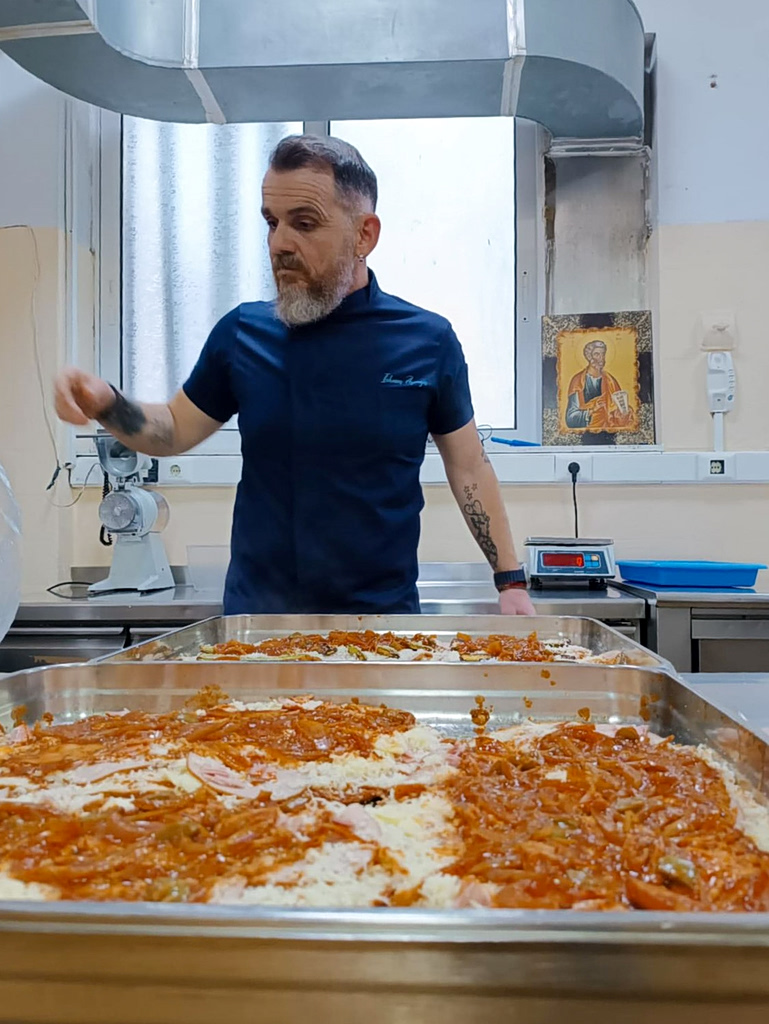 Chef Iakovos Apergis prepares ham and cheese pie at Tzaneio Hospital’s kitchen. / Photo courtesy of Iakovos Apergis.