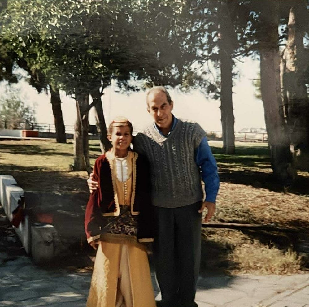 Boatenk with her grandfather in 1999 in Thessaloniki dressed in traditional Pontian costume. Credit: Evelin Antae Boatenk.