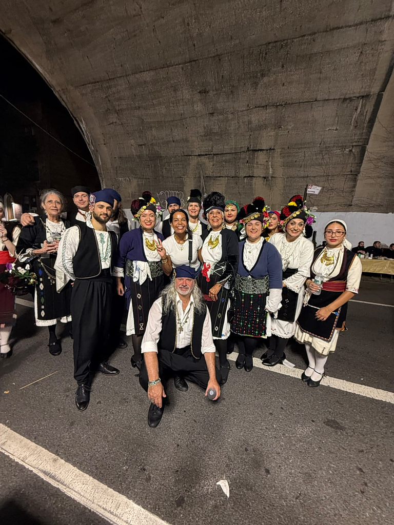 Boatenk surrounded by the Greek American Folklore Society dancers during the Greek Festival of St. Eirini Chrysovalantou in Astoria, NY, in the summer of 2025. Credit: Evelin Antae Boatenk