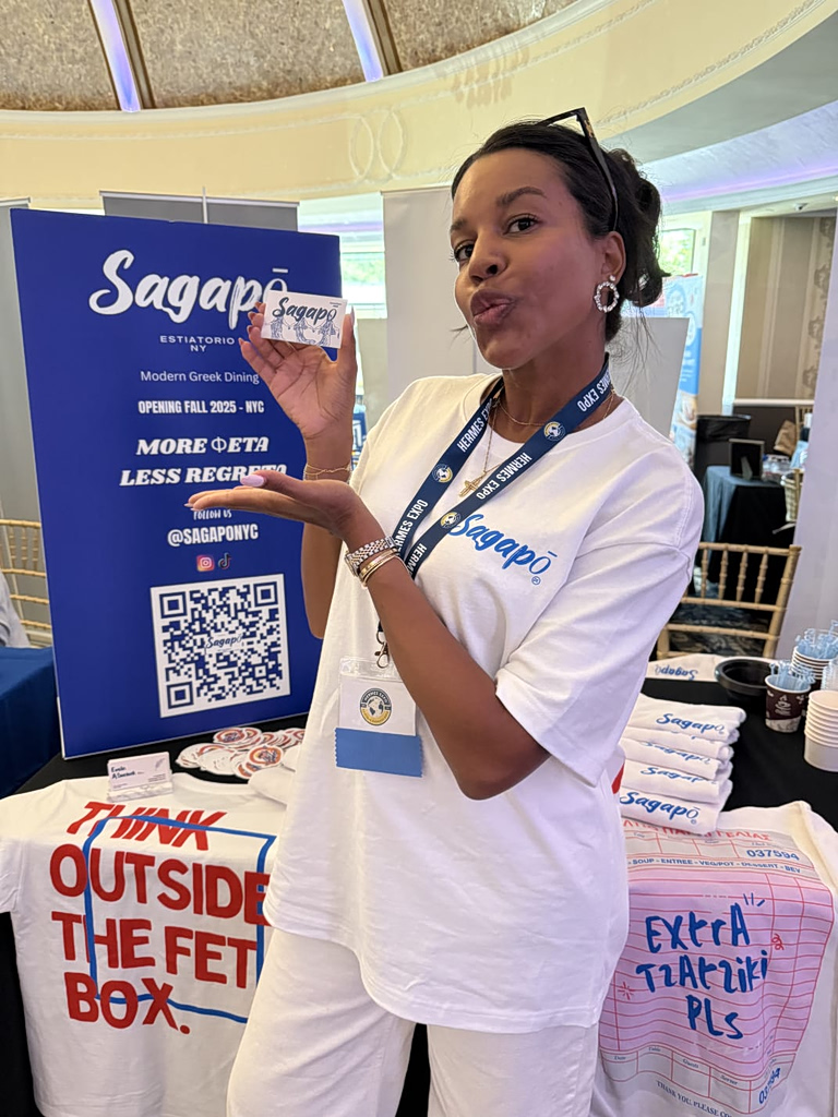 Evelin stands at the booth of her Greek restaurant, Sagapo, at the 2025 Greek Hermes Expo in New Jersey. Credit: Evelin Antae Boatenk
