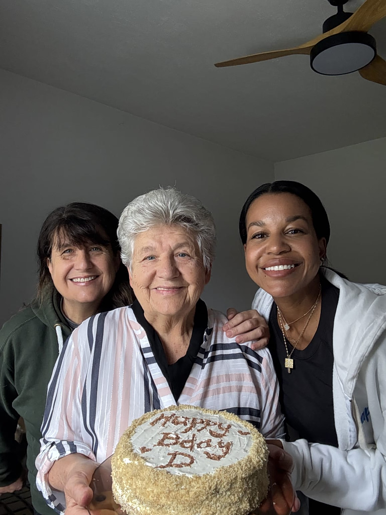 Evelin (right), with her mom (Afroditi Michailidou) and her grandma ( Margarita MIchailidou) at her village in Pellas, Central Macedonia, Greece, posing with a homemade cake. Credit: Evelin Antae Boatenk