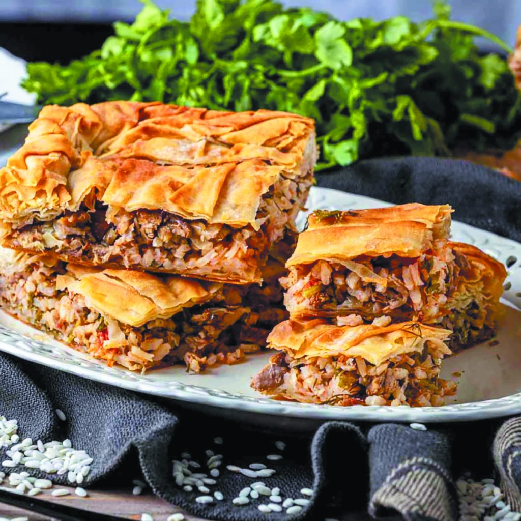 Kefalonian meat pie is a signature savory dish you’ll only find on this one Ionian island. It’s a hearty pie filled with a mixture of lamb, pork, or beef combined with rice, tomato, garlic, and fragrant spices like cinnamon, cloves, nutmeg, and bay wrapped in handmade filo dough and baked until golden. Often enriched with the local Robola wine and served warm at family meals or celebrations, it reflects the island’s rich agricultural and rustic traditions.