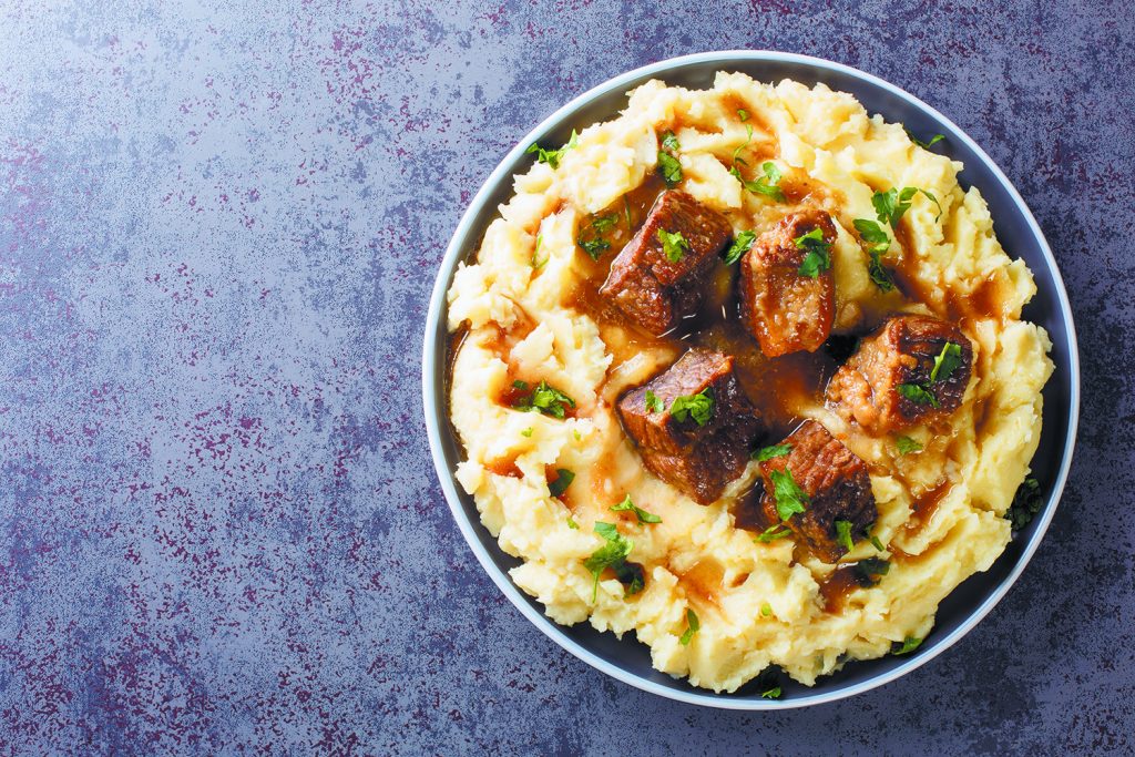Greek Sofrito Traditional Beef Dish with mashed potatoes from Corfu with mashed potatoes closeup in the plate on the table.
