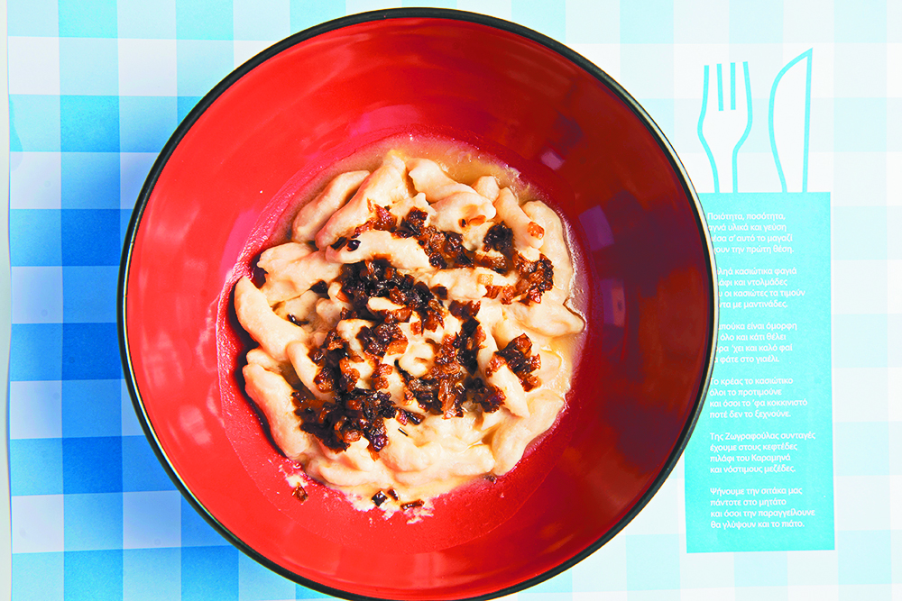 The tiny, rugged island of Kasos is home to one of the most iconic traditional pasta dishes in the Aegean: makarounes with sitaka. The makarounes are hand-rolled, indented pasta noodles made with just flour and water. Shaped individually by Kasian women using their fingertips, they are traditionally boiled then tossed with caramelized onions and topped generously with sitaka, a rare, creamy local dairy product made by slowly simmering fermented sheep or goat milk with flour and salt. This rich, tangy topping is exclusive to Kasos, where it’s considered a culinary treasure and often made in village homes.