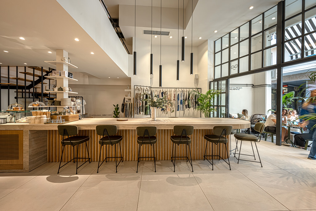 Teti Charitou and George Barlas saw a gap in the Greek market in bespoke professional wear for the ever-blooming service industry. “We were looking to open up a showroom when I spotted this space on a stroll around the city during quarantine in 2020.” recounts Teti Charitou, fashion designer and co-founder of The Makers. She knew right away the space had immense potential for something more than that. “That is when I brought my husband Ilias Stavropoulos into the picture, who is our chef and helped us create the menu to make this café the success it is today.” The final result of their collective efforts is a modern Athenian study hub.
