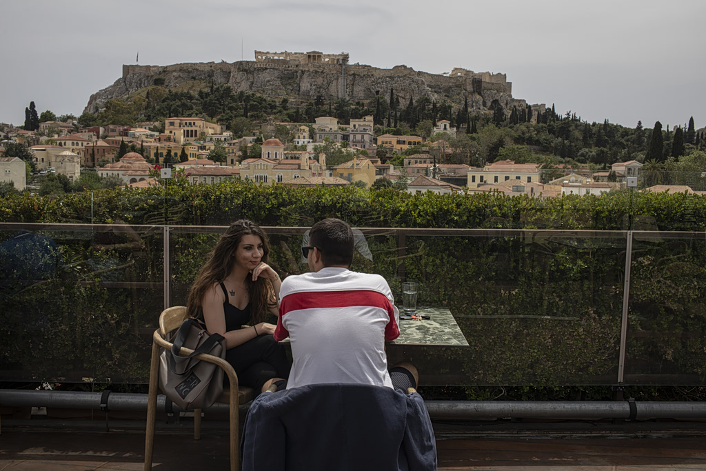 A man and a woman drink coffee in the Monastiraki district of Athens,with the ancient Acropolis hill in the background, Monday, May 3, 2021. (AP Photo/Petros Giannakouris)