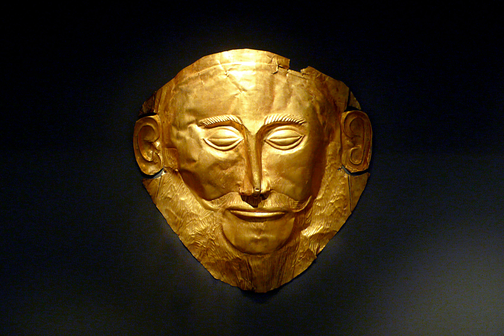 The “Mask of Agamemnon” is a 16th century BCE gold death mask found in 1876 by Heinrich Schliemann at Mycenae.