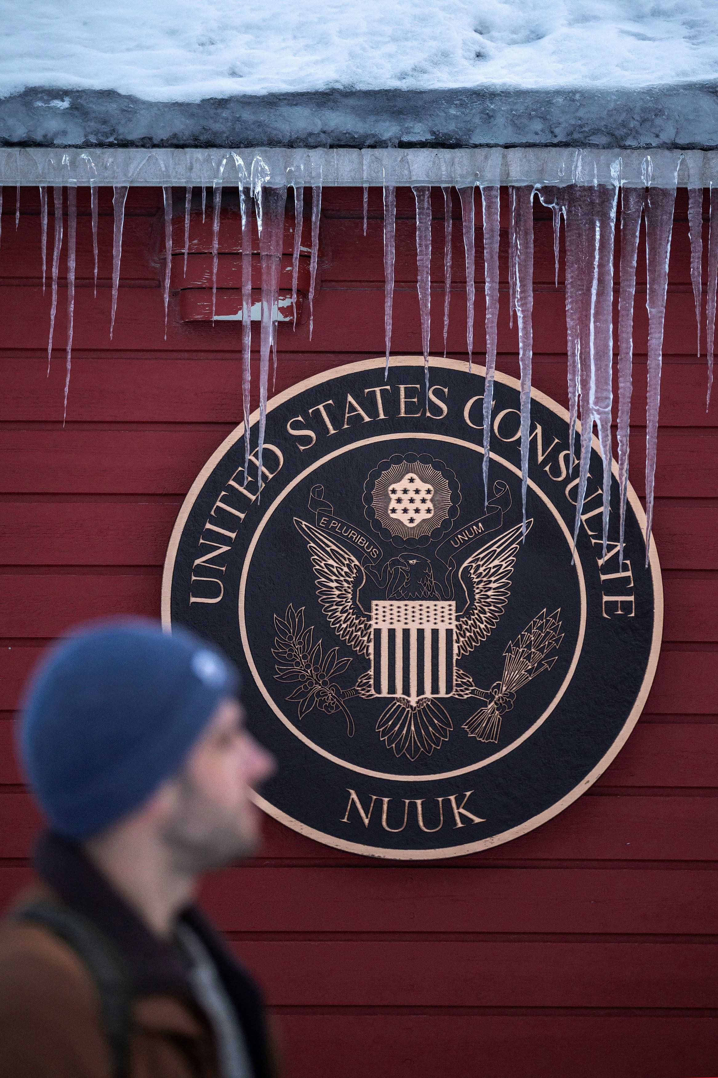 A journalist walks past icicles hanging from a gutter outside the U.S. Consulate in Nuuk, Greenland, January 13, 2026. REUTERS/Marko Djurica