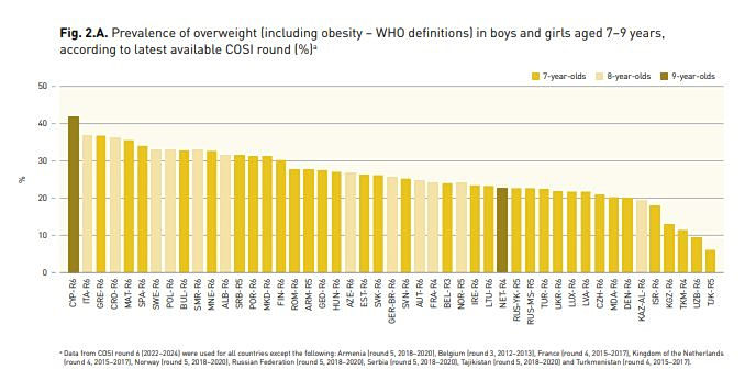 According to the latest COSI survey (2022–24), Greece still ranks among the countries with the highest childhood overweight and obesity levels in Europe: more than a third of 7-year-olds are overweight, and nearly one in five is obese. By age 9, the numbers climb further still. Only 16 percent of Greek children eat vegetables daily—the lowest rate among 31 nations surveyed.
