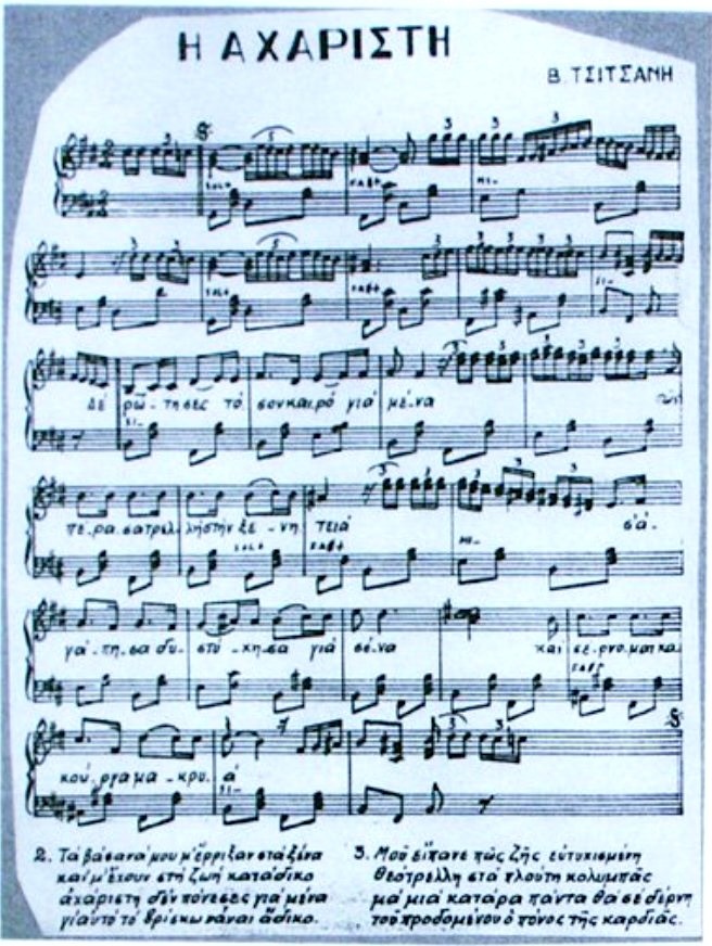 The sheet music to one of Vassilis Tsitsanis’ famous songs ‘I Acharisti’ (The Ungrateful One), released in 1947. Photo: Tsitsanis Museum Trikala