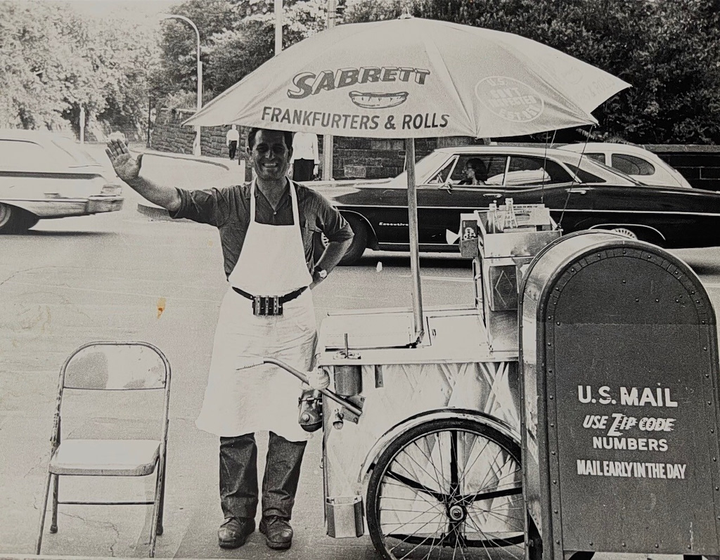 In one of them, a man in a dark blue ushanka and white apron is smiling beside his Sabrett hot dog cart, set against the façade of the Metropolitan Museum of Art on a sunny day in 1976. The man was Anastasios Velis—Fotis’s father and Francine’s grandfather.