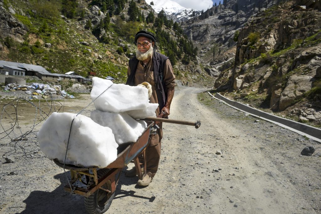May 15, 2024- Kallas Valleys, Pakistan: Leaving the valleys of Kalas, we are stopped by the police to check our passports. I get out of the jeep and, while waiting, I photograph this proud old man who is happily descending from the snowy mountain, carrying ice in his cart that he is going to use to preserve the meat and the few vegetables now that summer is coming.