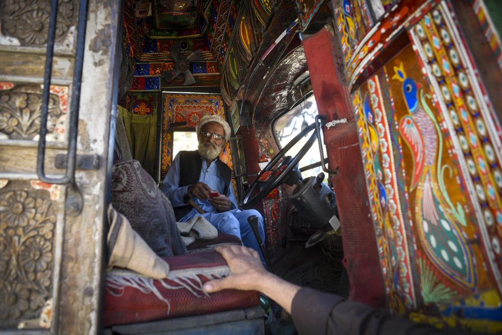 May 17, 2024- Kallas Valleys, Pakistan:A very old man in his hand-painted truck, drives to transport goods from Chitral, the nearest city, to the Kalash Valleys and back.