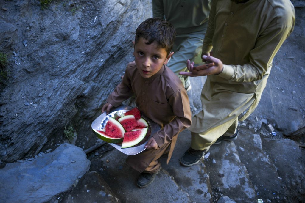 May 15, 2024- Kallas Valleys, Pakistan:A little boy from the Kalash tribe carries some watermelons to the dancers at the feast.