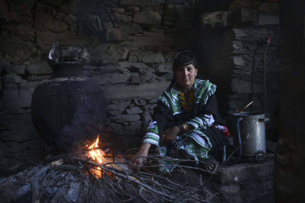 May 14, 2024- Kallas Valleys, Pakistan:Kalash woman prepares the fire in order to make her house-wine.