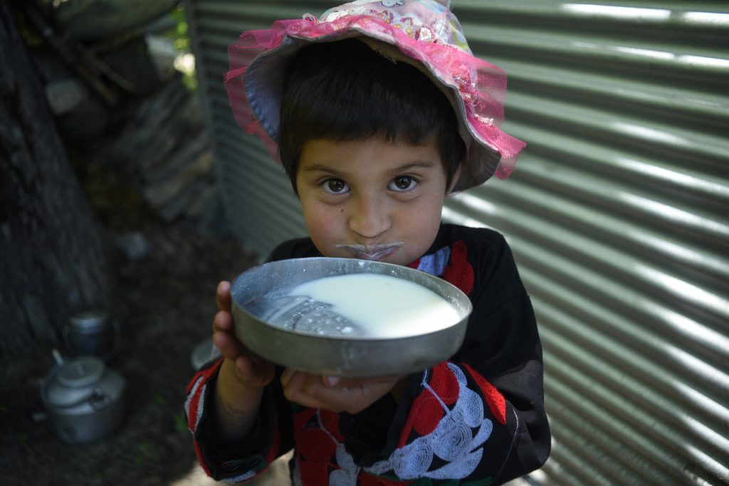 May 14, 2024- Kallas Valleys, Pakistan:Kalash little girls drinks the ‘sacred’ milk eagerly. During “Tsiripipi”, a special, local milk ceremony into the spring festival, women and girls pick the first flowers of the year, while families exchange gifts of cheese and milk which is considered sacred. During this feast, every shepherd shares the milk from his goats.