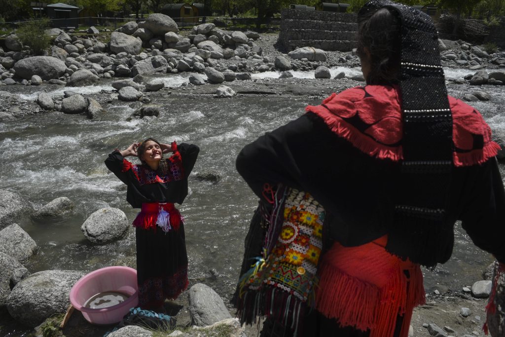 May 14, 2024- Kallas Valleys, Pakistan:Two young Kalash women wash their clothes in the river, enjoying their sisterhood, chatting in the bright sunlight to the music of the Chitral River. Kalash women can marry the man they fall in love with, study what they want at the universities of nearby cities, respect the tradition of their tribe and some like to the village, wear their traditional, colorful costumes during holy days and feasts experiencing the unique freedom of women in the entire country.