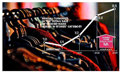 According to this data, “Retail sales of second-hand goods in stores” stood at 11.09 million euros in 2019. This figures rose to 15.1 million euros in 2021 before soaring to 26.52 million euros in 2022. The sector’s upward trend continued in 2023, when total turnover reached EUR 30.35 million, a year-on-year increase of 14.1% compared to the already booming 2022.