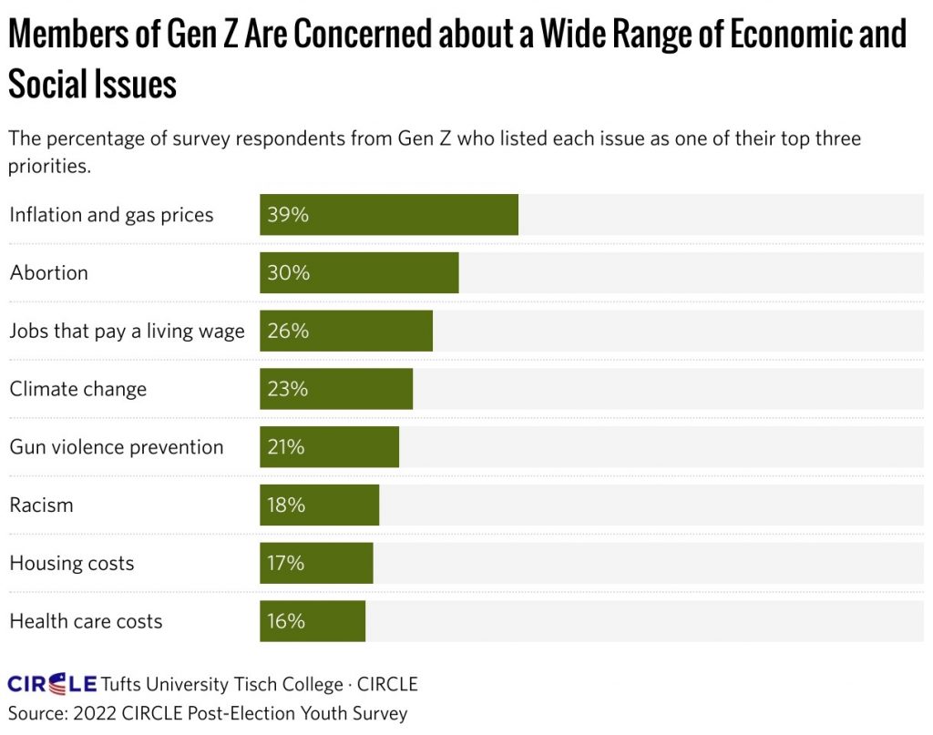 Several issues are of greater concern to younger voters than the general electorate. In a survey conducted by Tufts’ Tisch College Center for Information & Research on Civic Learning and Engagement after the 2022 election, Gen-Z were asked to rank their top three priorities. 39% ranked inflation and gas prices as a top concern, 30% abortion, 26% jobs that pay a living wage and 23% climate change. Gen-Z voters were slightly more likely than Millennials to say that gun violence and racism were among their top three issues.