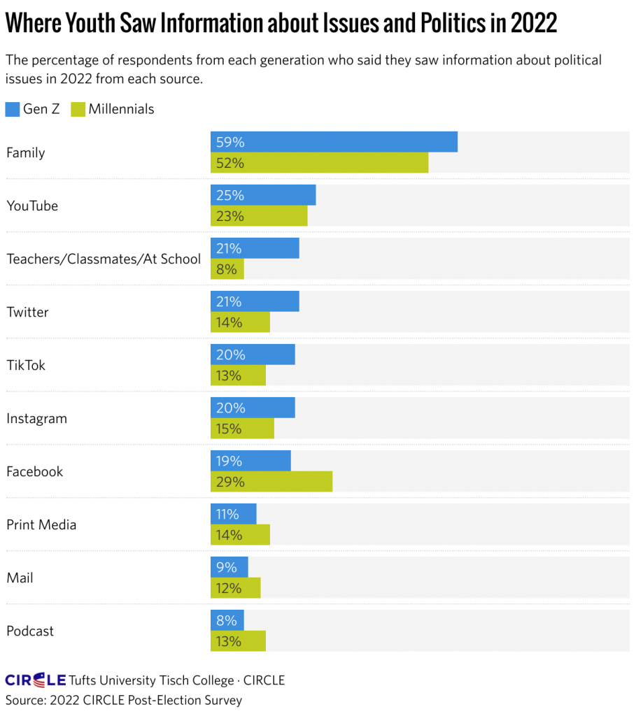 Gen-Z are also slightly more likely than the generations that precede them to get their news and information from Twitter, TikTok, and Instagram rather than Facebook, podcasts, and print media.