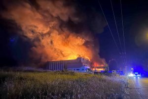 A production facility linked to the mass food poisoning of Greek elementary students went up in flames on Sunday night, but health authorities say enough has survived the fire for them to conduct an investigation for the presence of staph