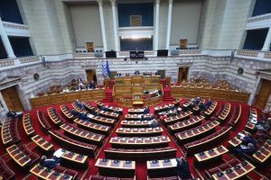 PM Kyriakos Mitsotakis spoke from Parliament’s podium during an off-the-agenda debate at the political party leaders’ level on foreign policy issues