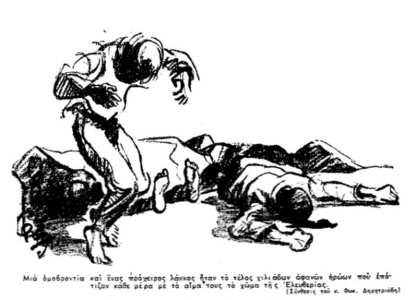 A 1946 sketch by political cartoonist Fokion Dimitriadis depicts her stern and dignified—head held high, unbowed by terror, surrounded by her seven children and the ideals they fought for.