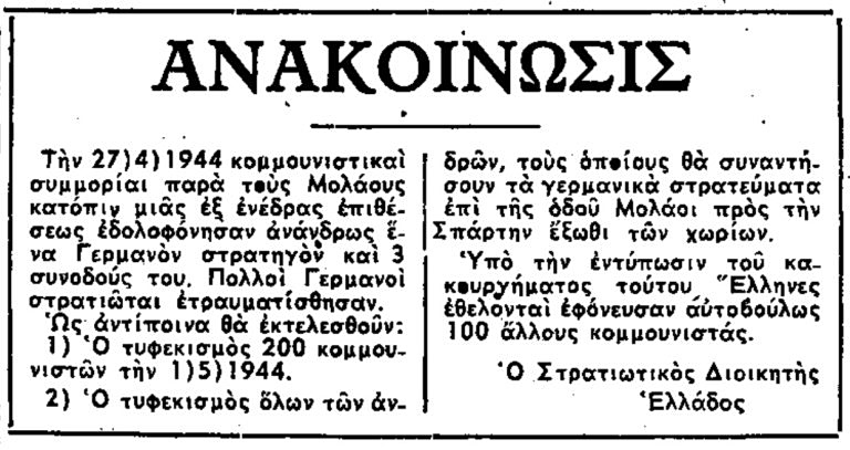 - The shooting of all men whom the German troops would encounter on the road from Molai to Sparta outside the villages.