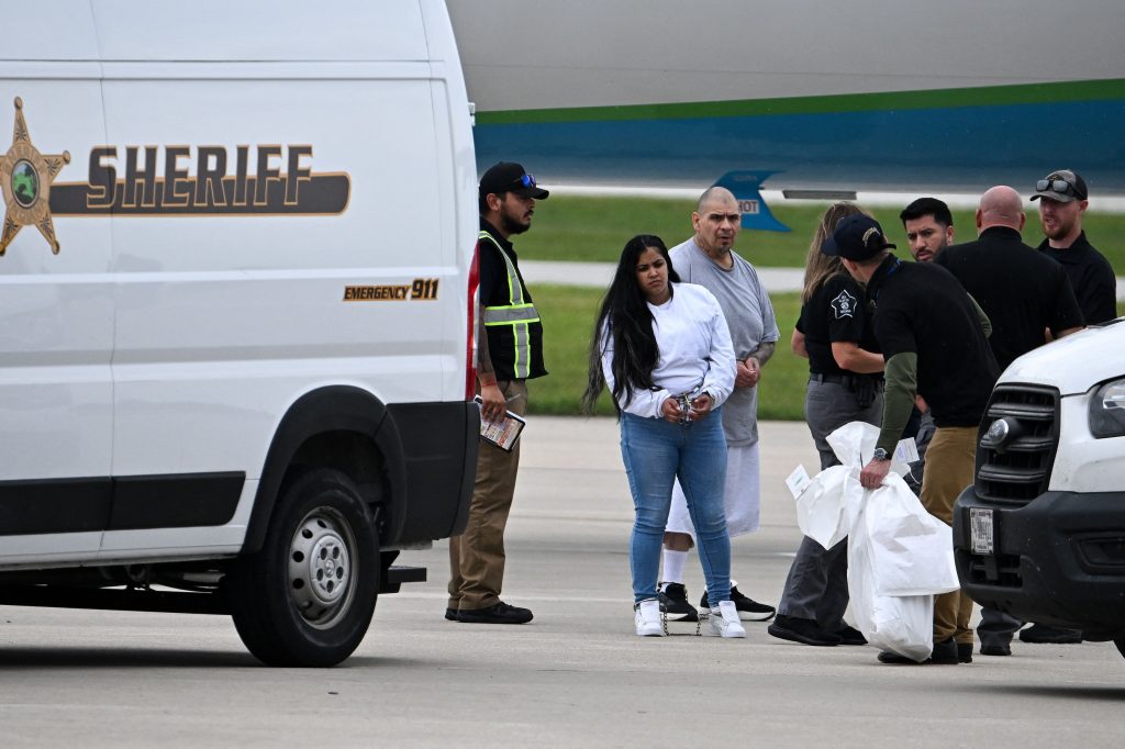 Migrants detained by U.S. Immigration and Customs Enforcement (ICE) and law enforcement officers stand on the tarmac, after being transferred from an ICE detention facility, at Gary/Chicago International Airport, in Gary, Indiana, U.S., June 20, 2025. REUTERS/Dylan Martinez