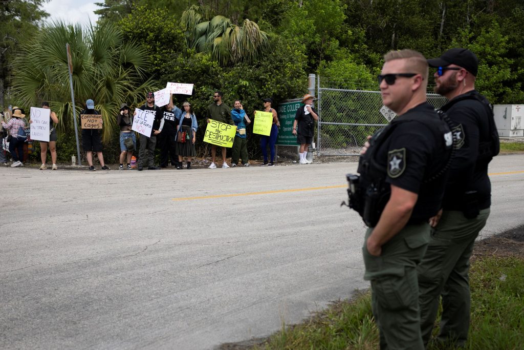 People demonstrate as pro-immigrant protesters, environmental groups, Everglades advocates, members of the Miccosukee Native American community and residents gather outside the Dade-Collier Training and Transition Airport as they rally against the state’s forthcoming “Alligator Alcatraz” ICE detention center in Ochopee, Florida, U.S. June 28, 2025. REUTERS/Marco Bello