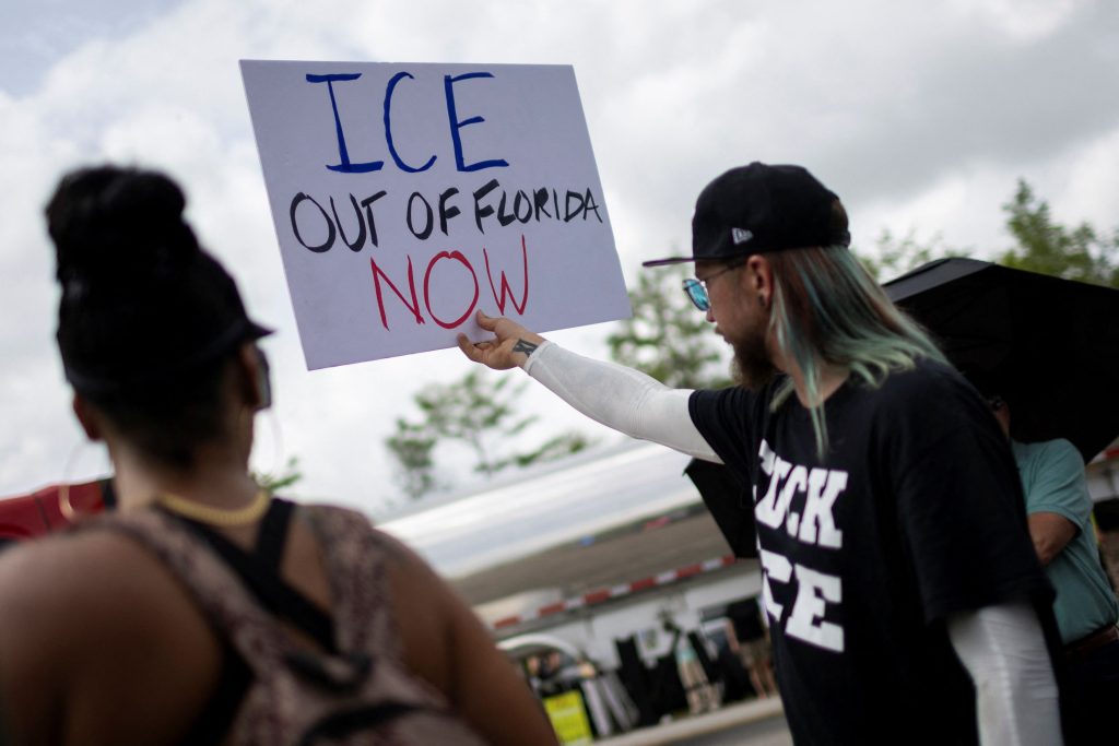 SENSITIVE MATERIAL. THIS IMAGE MAY OFFEND OR DISTURB A man holds a sign as pro-immigrant protesters, environmental groups, Everglades advocates, members of the Miccosukee Native American community and residents gather outside the Dade-Collier Training and Transition Airport as they rally against the state’s forthcoming “Alligator Alcatraz” ICE detention center in Ochopee, Florida, U.S. June 28, 2025. REUTERS/Marco Bello