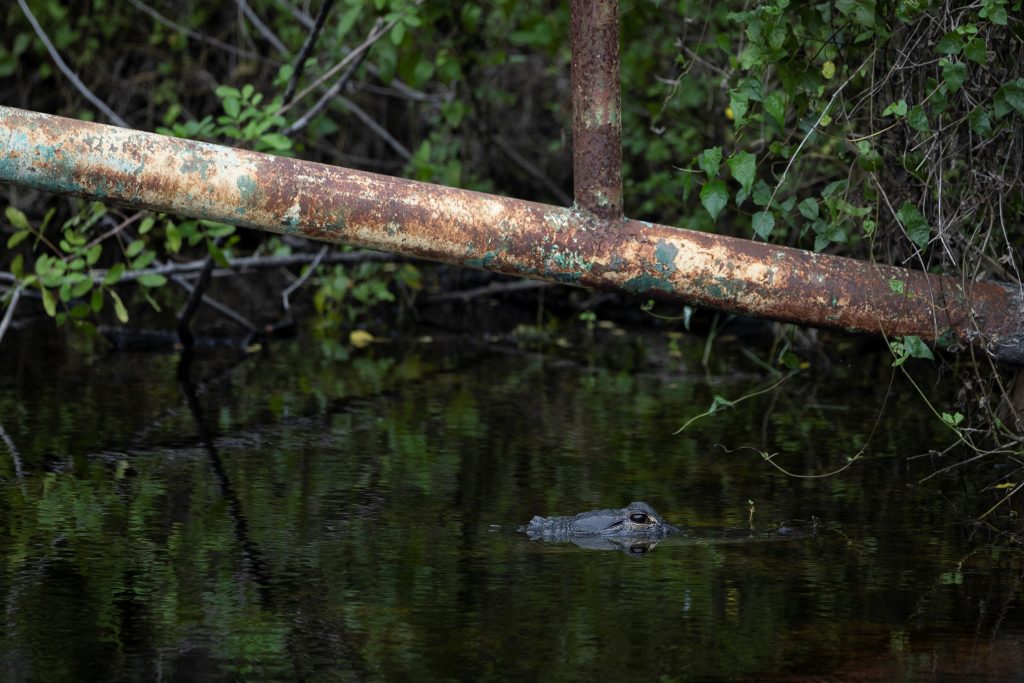 An alligator rests on the surface of the water nearby the Dade-Collier Training and Transition Airport as people rally against the state’s forthcoming “Alligator Alcatraz” ICE detention center in Ochopee, Florida, U.S. June 28, 2025. REUTERS/Marco Bello