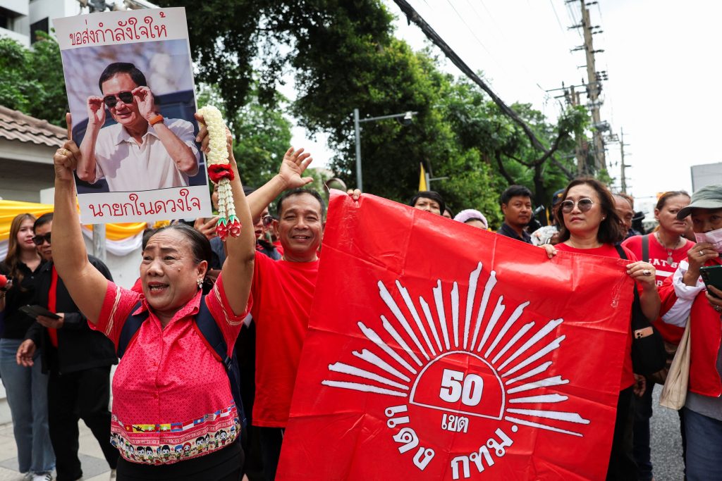 Pheu Thai supporters gather to support former Thai Prime Minister Thaksin Shinawatra, who is facing charges of insulting the monarchy under Thailand’s strict lese-majeste law as well as violating the Computer Crime Act, as he leaves a Criminal Court after a trial, in Bangkok, Thailand, July 1, 2025. REUTERS/Chalinee Thirasupa