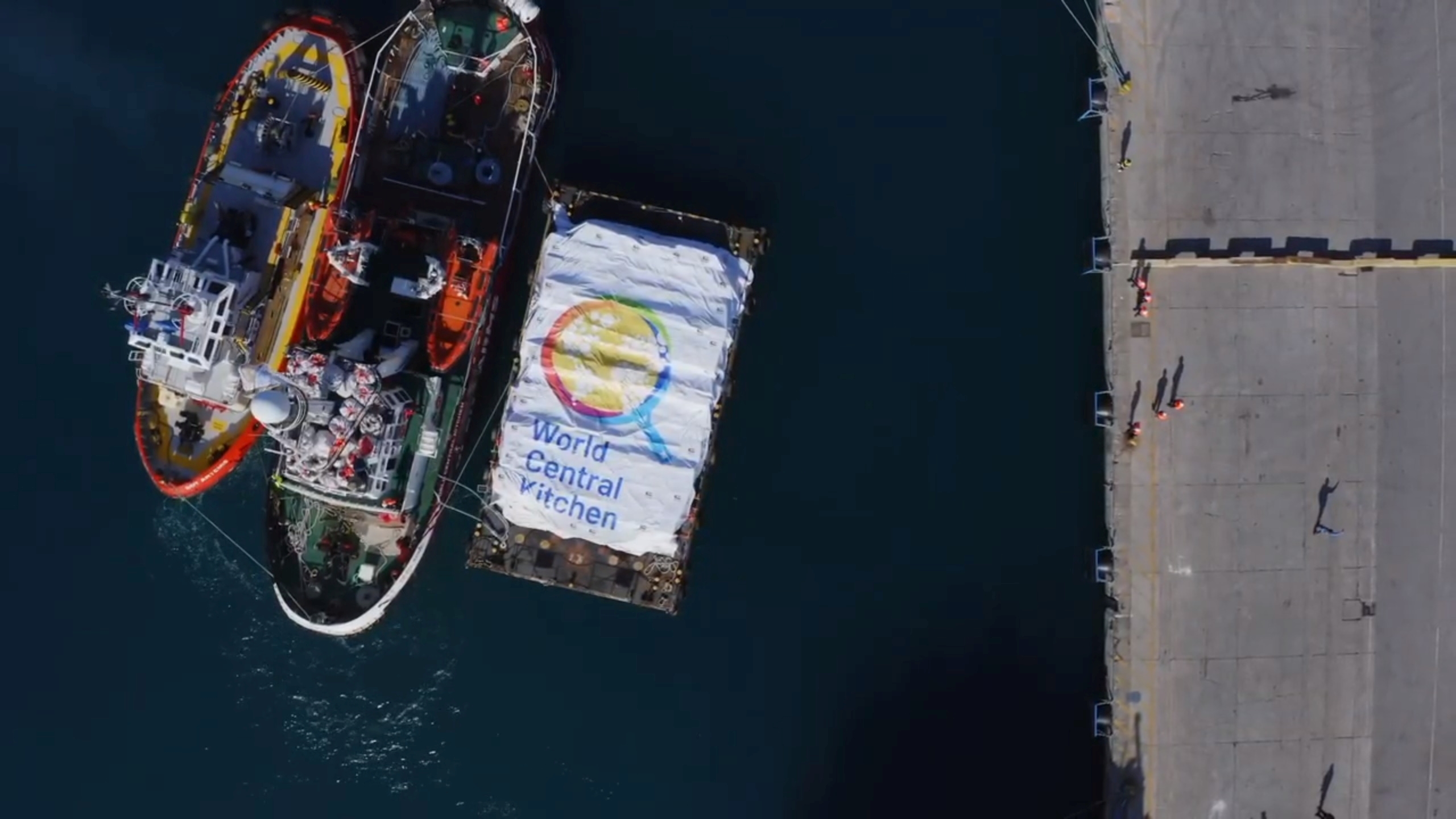 A still taken from a handout drone video made available by World Central Kitchen (WCK) shows the Open Arms NGO rescue vessel (C) being towed at open sea dragging a barge (R) loaded with food aid provided by WCK, as it leaves port headed for the Gaza Strip, in Larnaca, Cyprus, 12 March 2024. EPA/WCK HANDOUT BEST QUALITY AVAILABLE HANDOUT EDITORIAL USE ONLY/NO SALES HANDOUT EDITORIAL USE ONLY/NO SALES
