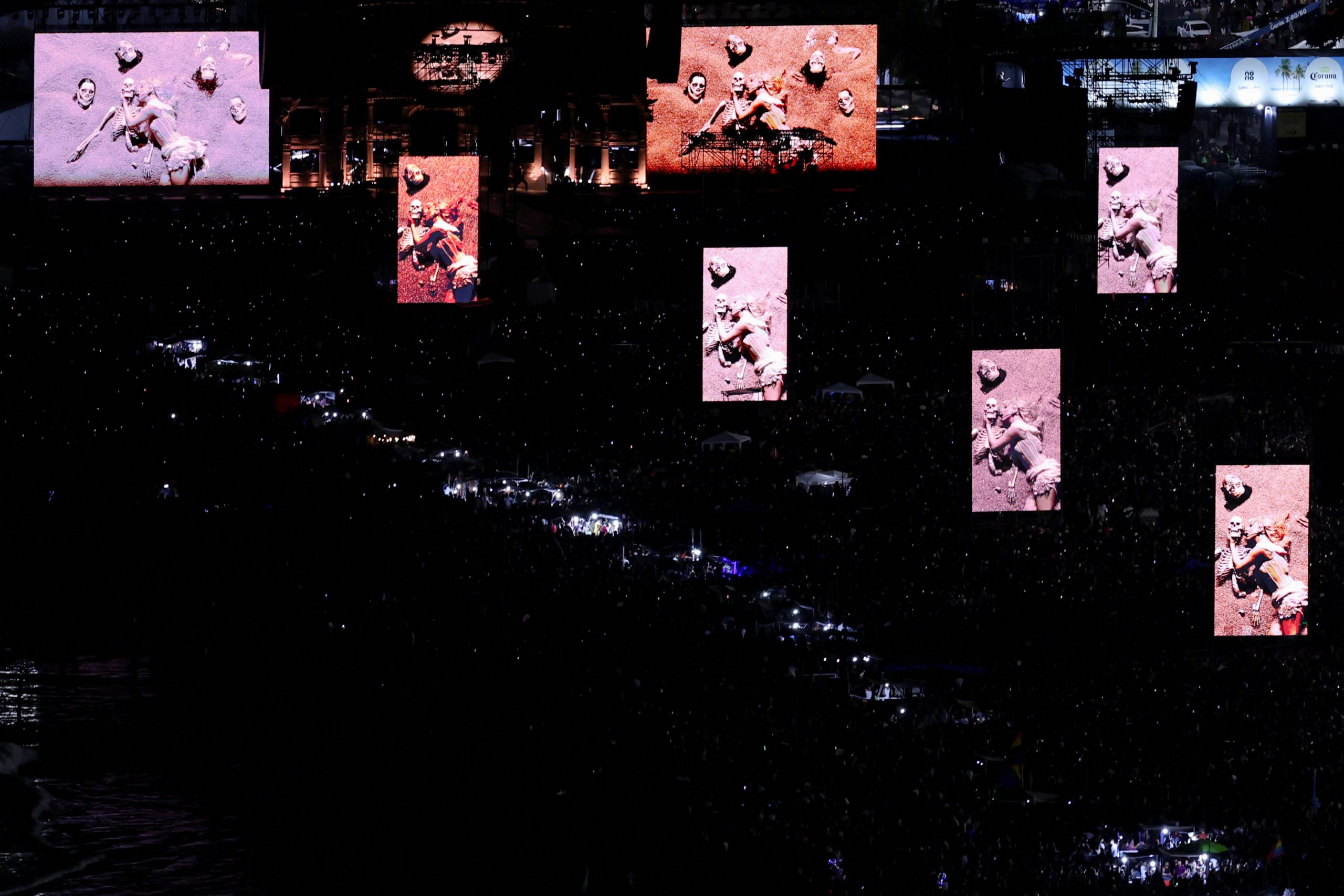 Displays show Lady Gaga performing at an open concert in Copacabana beach as seen from Leme fort, in Rio de Janeiro, Brazil May 3, 2025. REUTERS/Aline Massuca