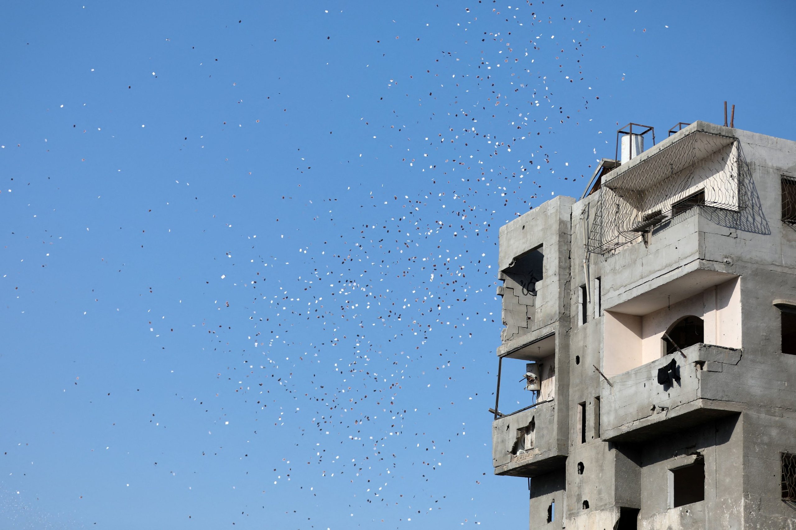 Leaflets that were dropped by Israeli forces, ordering residents of Gaza City to evacuate, fall next to a damaged building in Gaza City September 17, 2025. REUTERS/Dawoud Abu Alkas