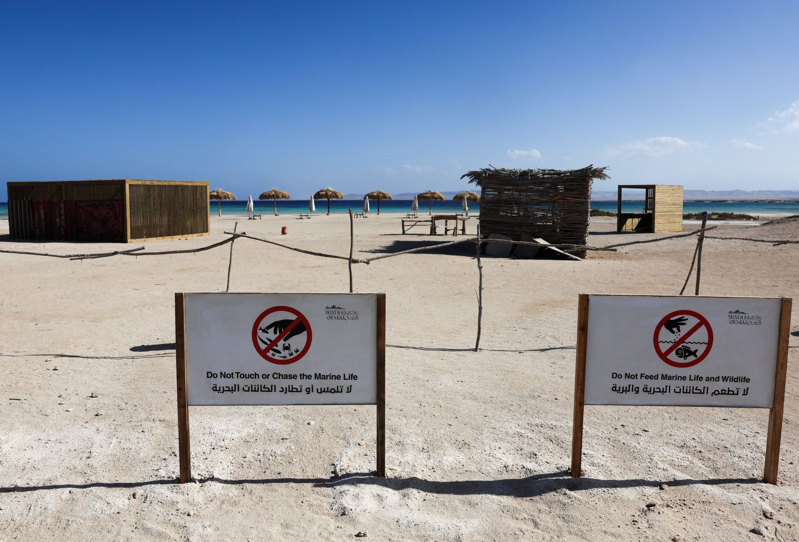 View of signs surrounded with a barrier made of wooden sticks in front of Ras Hankorab beach in Wadi el-Gemal National Park, home to one of the country’s last unspoiled marine ecosystems with crystal clear waters and white sands, at southern Egypt’s Red Sea coast in Marsa Alam, Egypt March 23, 2025. REUTERS/Stringer