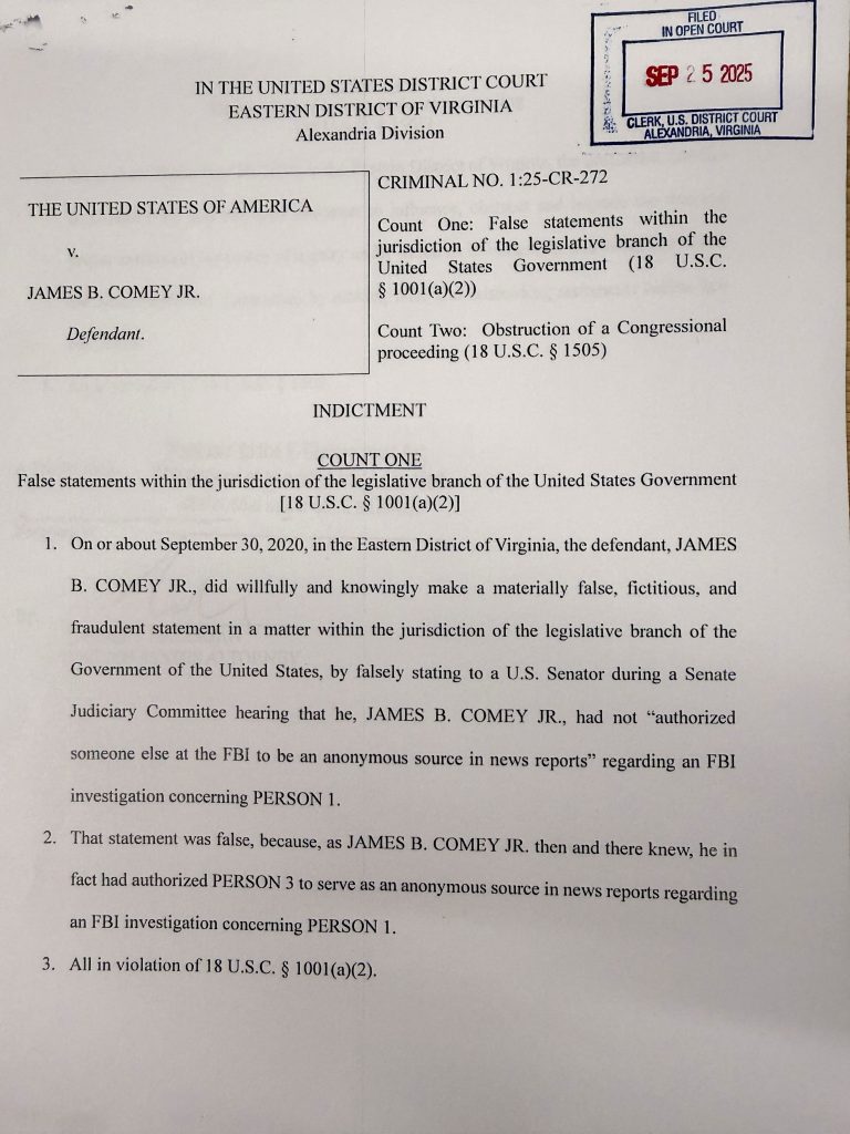 The indictment focuses on Comey’s 2020 congressional testimony, where prosecutors allege he misled lawmakers about authorizing anonymous disclosures related to the FBI’s Russia investigation.