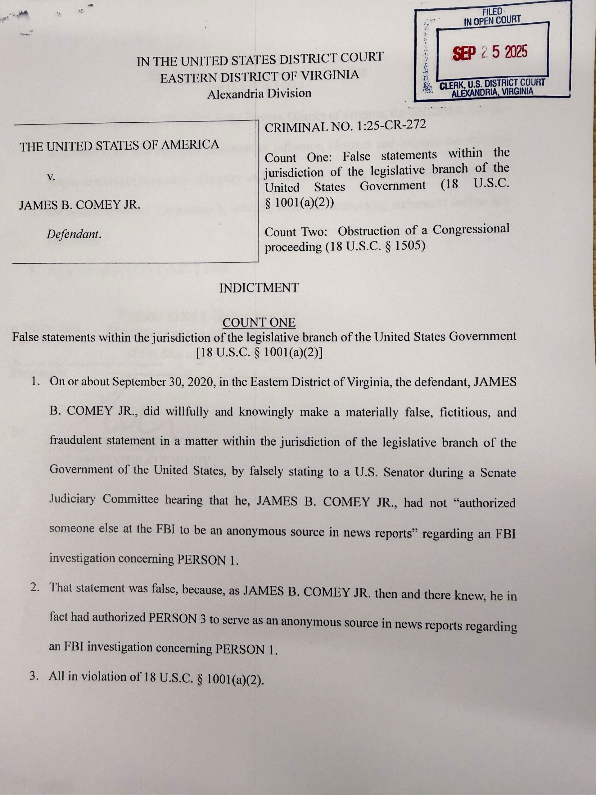 A document indicting former FBI Director James Comey on criminal charges of false statements and obstruction, in Washington, D.C., U.S., September 25, 2025. REUTERS/Suheir Sheikh