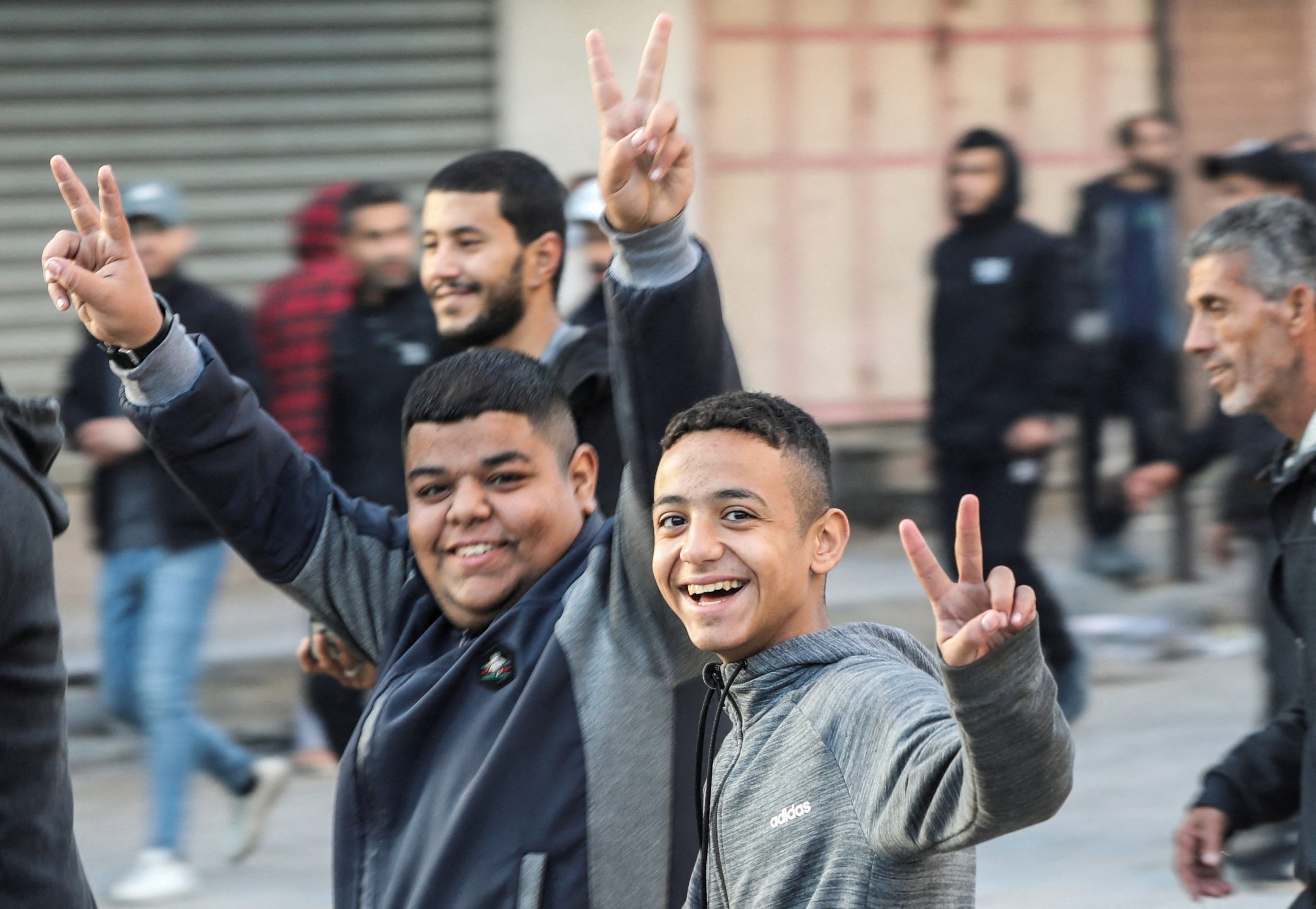Palestinians hug each other before a ceasefire between Israel and Hamas takes effect, in Gaza City, January 19, 2025. REUTERS/Dawoud Abu Alkas