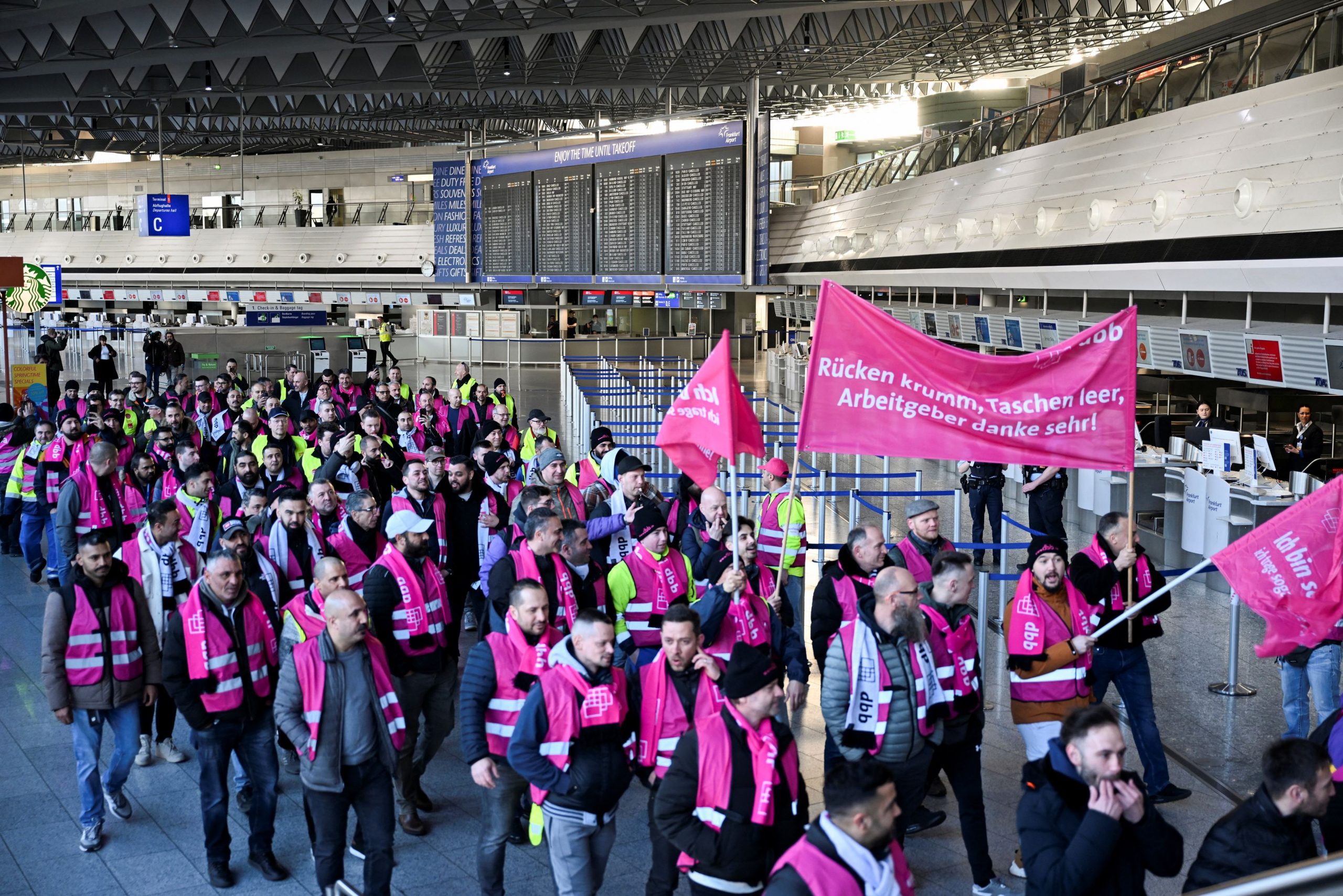 Airport workers demonstrate at the Frankfurt Airport during a 24-hour strike called by the German trade union Verdi over a wage dispute in Frankfurt, Germany March 10, 2025. REUTERS/Jana Rodenbusch