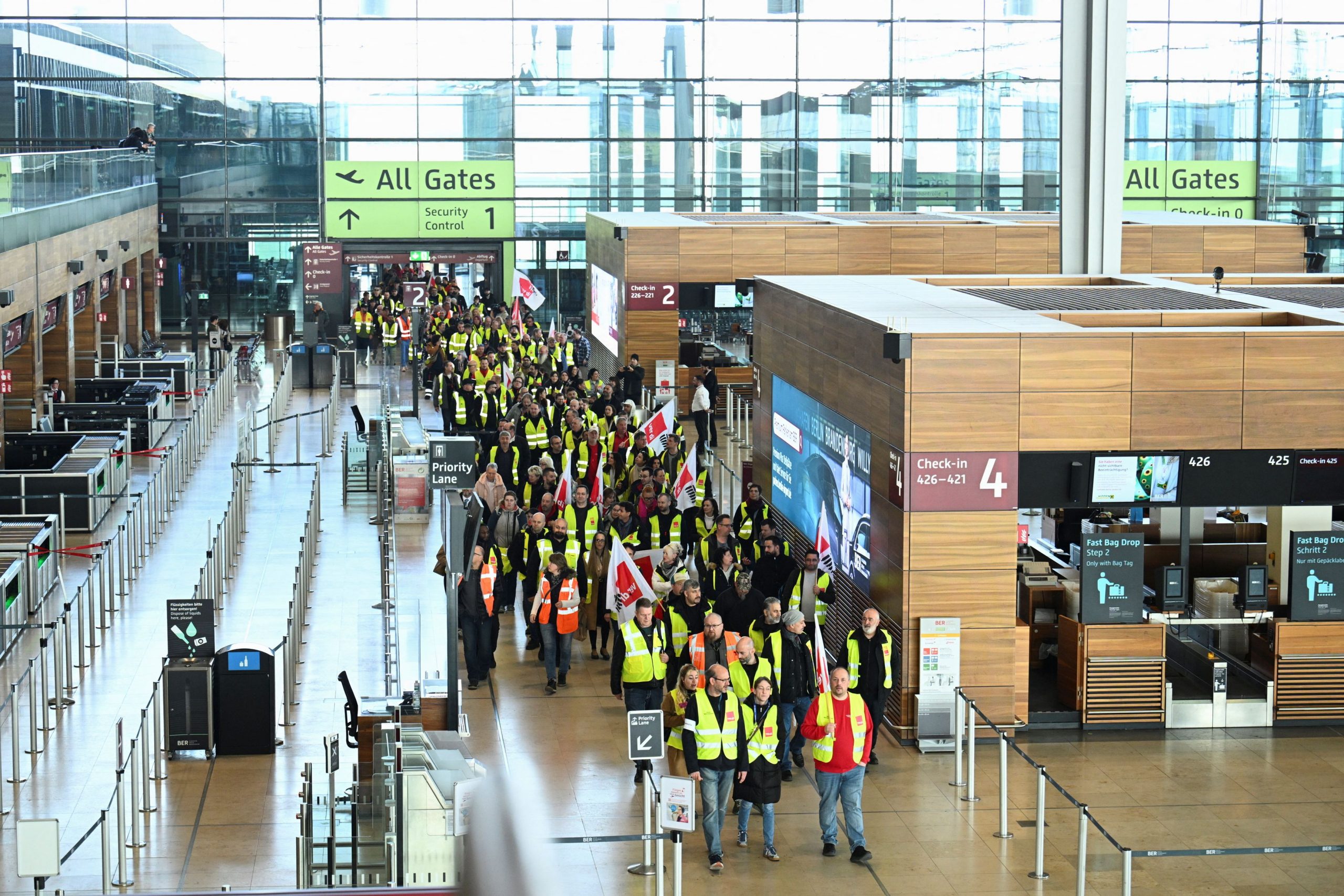 Airport workers demonstrate during a 24-hour strike at Berlin airport called by the German trade union Verdi over a wage dispute in Berlin, Germany March 10, 2025. REUTERS/Annegret Hilse