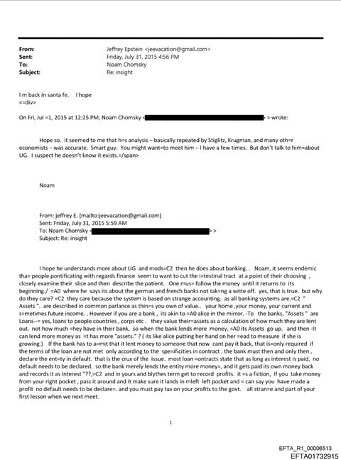 In another email to Chomsky, Epstein emphasizes the disproportionate flow of bailout funds: