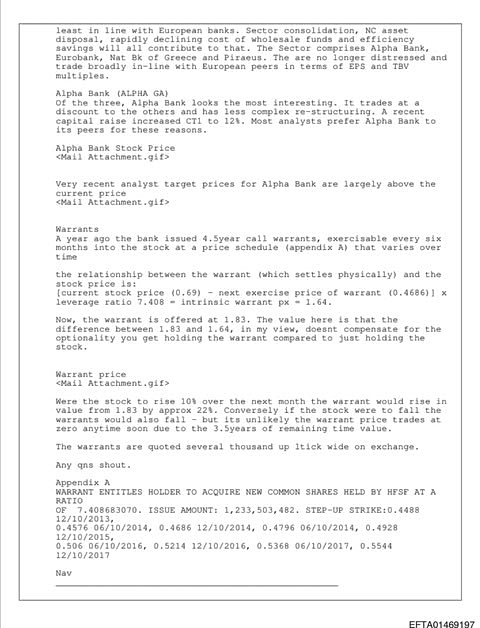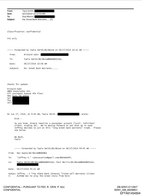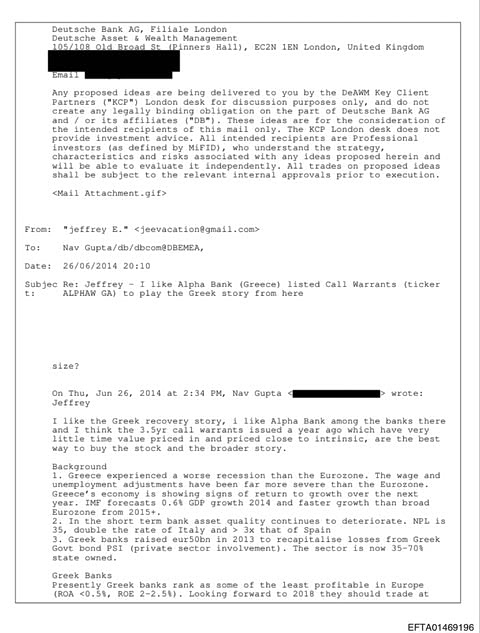 Epstein was informed about potential investments in Greek bank warrants. Tazia Smith noted the setup of local accounts to prepare for trades in “long Greek bank warrants,”. The emails included background on Greek banks’ recapitalization following the Private Sector Involvement (PSI) in government bonds, noting that banks had high state ownership (35–70%) but were expected to return to profitability.
