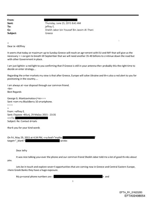 Epstein corresponded with the late George G. Mantzavinatos regarding investment timing and opportunities in Greece and Central Eastern Europe. Mantzavinatos advised that Greece would likely reach an agreement with the EU and IMF by the end of June 2015, providing temporary financial stability until September, when another €35–40 billion would be needed. He suggested this was an opportune moment for Epstein to consider entering the Greek market, particularly in banks with large exposures. Mantzavinatos also highlighted other geopolitical risks, such as Ukraine, signaling potential investment considerations in Europe.