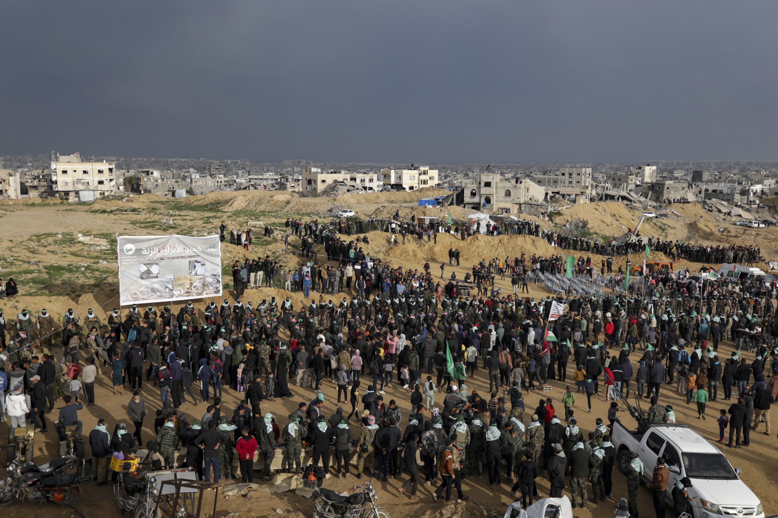 According to AP News, Hamas displayed four black coffins on a stage surrounded by banners as Red Cross vehicles arrived at the handover site on the outskirts of Khan Younis, southern Gaza. Thousands of people, including masked Hamas militants, were present. Israeli TV channels did not broadcast the handover, and Hostage Square in Tel Aviv, usually a focal point for such events, remained empty due to rain.