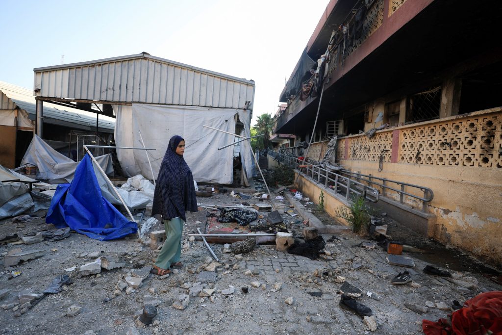 A Palestinian inspects the damage at a school sheltering displaced people, following an overnight Israeli airstrike, in Gaza City, July 3, 2025. REUTERS/Dawoud Abu Alkas