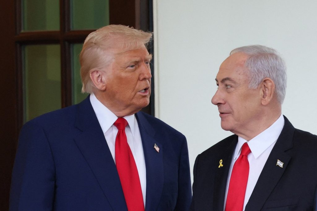 U.S. President Donald Trump welcomes Israeli Prime Minister Benjamin Netanyahu at the entrance of the White House in Washington, D.C., U.S., April 7, 2025. REUTERS/Leah Millis